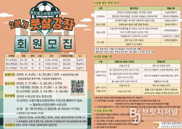 브릿지저널 김경미 기자 | 수원시청소년청년재단 칠보청소년청년센터는 지역 청소년들의 건강한 여가 생활과 체력 증진을 위해녪년 2분기 문화강좌(풋살 교실)’수강생을 모집한다고 밝혔다.