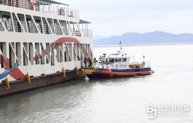브릿지저널 김경미 기자 | 완도해양경찰서(서장 김태환) 지난 5일 전남 완도군 화흥포항 인근 해상에서 관계기관과 함께 여객선 내 전기차 화재 사고에 대비한 합동 훈련을 실시했다.