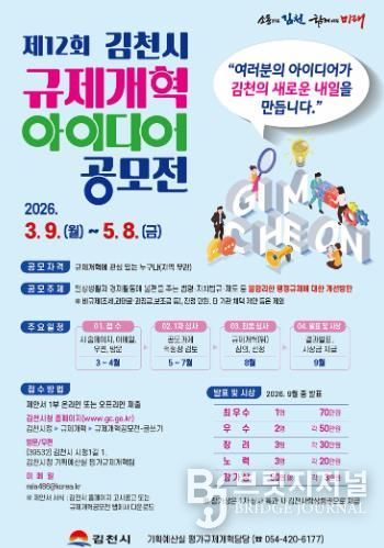 브릿지저널 정보영 기자 | 김천시는 시민의 아이디어를 바탕으로 일상생활과 기업활동 과정에서 발생하는 불합리한 규제를 개선하기 위해 제12회 규제개혁 아이디어 공모전을 개최한다.