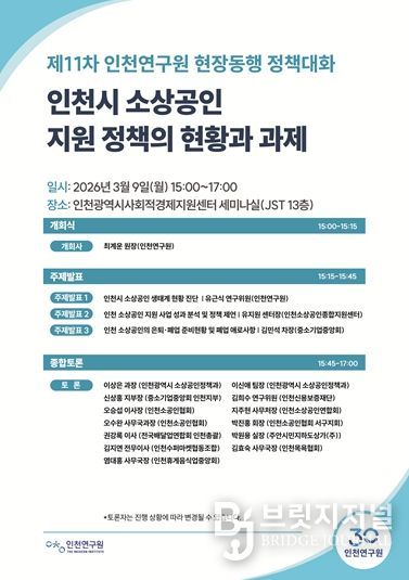 브릿지저널 김경미 기자 | 인천연구원은 2026년 3월 9일 오후 3시 인천광역시사회적경제지원센터 세미나실에서 “인천시 소상공인 지원 정책의 현황과 과제”라는 주제로 '제11차 현장동행 정책대화'를 개최한다.