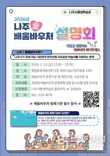 나주시는 오는 13일 오후 1시 복합문화체육센터 1층 세미나실1(빛가람동 199)에서 ‘2026년 나주애(愛) 배움바우처 설명회’를 개최한다고 6일 밝혔다.