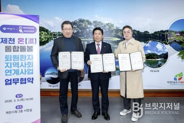 브릿지저널 김경미 기자 | 제천시는 지난 5일 세명대학교 부속 한방병원, 예성요양병원과 함께‘제천 온(溫) 퇴원 환자 지역사회 연계사업’ 추진을 위한 업무협약을 체결했다고 밝혔다.