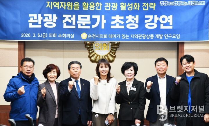 브릿지저널 김경미 기자 | 순천시의회는 6일 의회 소회의실에서 ‘테마가 있는 지역관광상품 개발 연구모임(회장 장경순)’ 주관으로 관광 전문가 초청 강연을 개최했다.