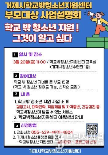 브릿지저널 김경미 기자 | 거제시는 3월 20일 오전 11시, 학교밖청소년지원센터에서 학교 밖 청소년 및 부모, 보호자를 대상으로 사업설명회를 실시한다고 밝혔다.