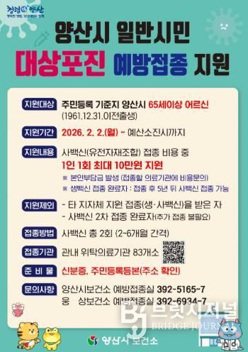 브릿지저널 김경미 기자 | 양산시는 2026년부터 생애주기별 맞춤형 예방접종 지원을 확대 시행하며 시민 건강권 강화에 본격 나선다고 밝혔다.