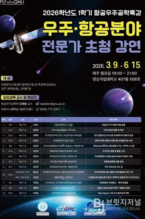 브릿지저널 김경미 기자 | 경상국립대학교 위성시스템핵심기술연구센터는 3월 9일부터 6월 15일까지 13차례에 걸쳐 우주‧항공 분야 전문가 초청강연을 진행한다.