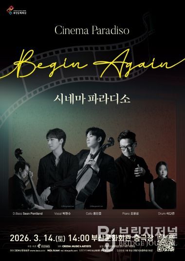브릿지저널 윤나영 기자 | (재)부산문화회관(대표이사 차재근)은 오는 3월 14일 오후 2시, 부산문화회관 중극장에서 영화음악 클래식 공연 ‘시네마 파라디소 '비긴 어게인(Begin Again)'’을 선보인다.