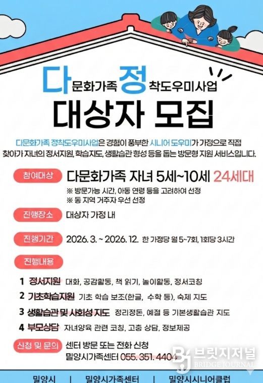 브릿지저널 김경미 기자 | 경남 밀양시는 언어·문화적 차이와 양육 정보 부족으로 어려움을 겪는 다문화가족의 안정적 정착을 돕기 위한 ‘다정(多情)사업’을 본격 추진한다고 9일 밝혔다.