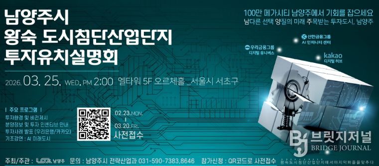 브릿지저널 김경미 기자 | 남양주시는 오는 25일 서울 서초구 엘타워에서 ‘왕숙 도시첨단산업단지 투자유치설명회’를 개최하고, 첨단산업 투자거점으로 급부상하는 시의 투자환경을 기업에 소개한다고 밝혔다.