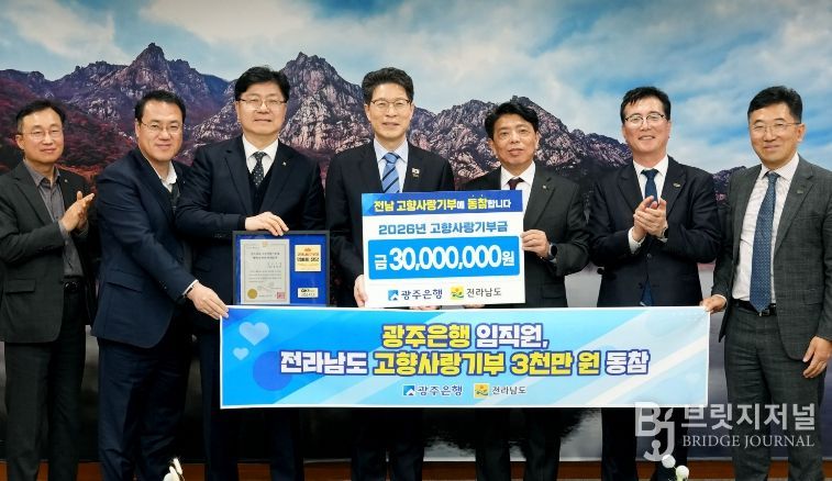 브릿지저널 김경미 기자 | 전라남도는 광주은행이 정일선 은행장과 임직원들이 십시일반 모은 성금으로 고향사랑기부금 3천만 원을 전달해왔다고 밝혔다.