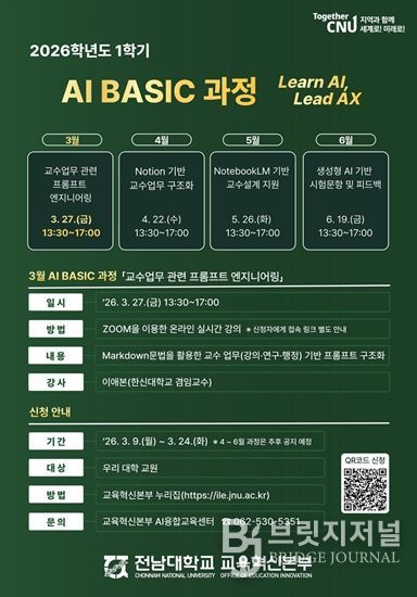 10일 전남대에 따르면, 전남대학교 교육혁신본부(본부장 정은경)는 2026학년도 1학기 전 교원을 대상으로 ‘AI BASIC 과정’을 운영한다.