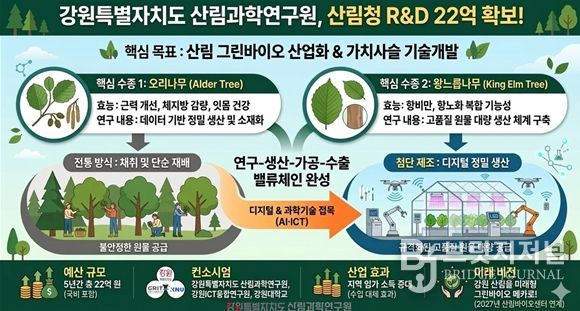 브릿지저널 윤나영 기자 | 강원특별자치도 산림과학연구원은 산림청이 주관하는 ‘산림분야 그린바이오 미래형 가치사슬 기술개발’ 공모사업에 최종 선정돼 5년간 총 22억 원의 국비를 확보했다고 밝혔다.