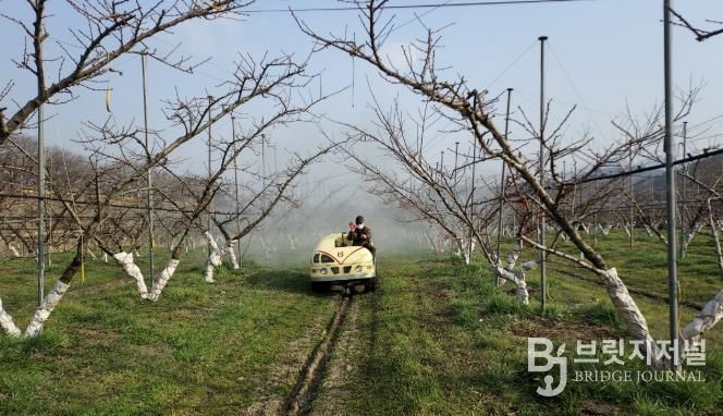브릿지저널 김경미 기자 | 옥천군농업기술센터는 복숭아 개화기를 앞두고 월동 병해충 적기 방제를 위한 현장 기술지도를 강화하고 있다.