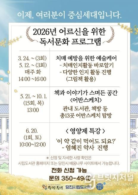 브릿지저널 정보영 기자 | 당진시는 어르신들이 책을 매개로 다양한 문화 활동을 경험하며 건강과 삶의 질을 높이기 위해 시립송악도서관에서 어르신 대상 독서문화 프로그램을 운영한다고 10일 밝혔다.
