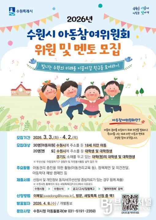 브릿지저널 김경미 기자 | 수원특례시는 ‘2026년 아동참여위원회’에서 활동할 아동 위원과 대학(원)생 멘토를 모집한다.