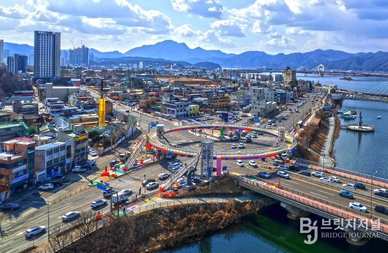 소양아트서클은 호반사거리에 조성된 원형 구조의 보행 시설로 단순히 건너가는 육교를 넘어 걷는 순간 완성되는 공공예술이자 도심 체험 공간으로 기획됐다.