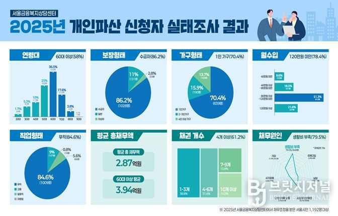 브릿지저널 김경미 기자 | 서울시복지재단 서울금융복지상담센터는 지난해 센터로 접수된 개인파산 신청 유효 데이터 1,192건을 분석한' 20025년 개인 파산면책 지원 실태'를 9일 발표했다.