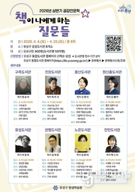 브릿지저널 정보영 기자 | 대전 유성구는 4월 한 달간 관내 8개 공공도서관에서 도서관의 날·도서관 주간을 맞아 ‘2026년 상반기 공감인문학 강연’을 운영한다.
