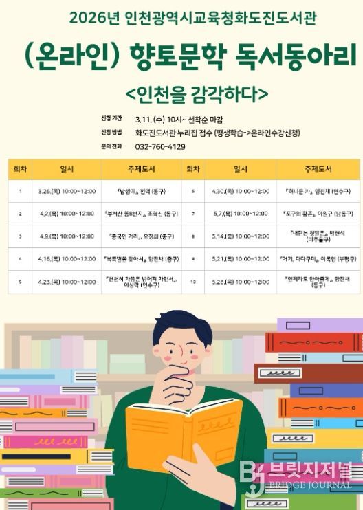 브릿지저널 김경미 기자 | 인천광역시교육청화도진도서관은 인천 시민의 지역적 정체성과 문학적 감수성을 함양하기 위하여, 오는 11일부터 향토문학 독서동아리 ‘인천을 감각하다’ 참여자를 모집한다.