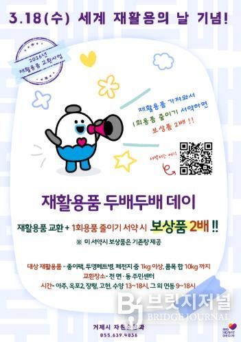 브릿지저널 김경미 기자 | 거제시는 3월 18일 ‘세계 재활용의 날’을 맞아 자원재활용의 중요성을 알리고, 1회용품 줄이기 실천을 확산하기 위해 ‘재활용품 교환사업’ 보상품을 2배로 지급하는 '재활용품 두배두배 데이'를 개최한다.