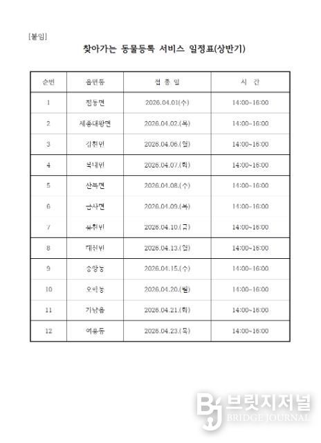 이번 서비스는 춘계 광견병 예방접종 기간에 맞춰 진행되며, 읍·면·동별 지정된 운영 일정(별첨)에 따라 행정복지센터 접수 창구를 방문해 신청서를 작성하면 된다. 동물등록은 외장형 무선식별장치를 부착하게 되며, 반려동물 소유주는 3,000원의 수수료를 납부하면 된다.