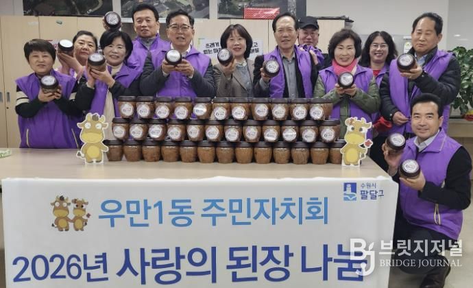 브릿지저널 김경미 기자 | 수원시 팔달구 우만1동 주민자치회는 지난 9일, 우만1동 행정복지센터에서 지난해 전통 방식으로 담가 숙성한 된장을 관내 취약계층에게 전달하는 ‘사랑의 된장 나눔 행사’를 진행했다.