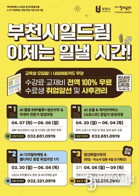 브릿지저널 김경미 기자 | 부천시는 부천시일드림센터와 함께 2026년 상반기 취·창업 교육생을 모집한다. 이번 교육은 내일배움카드 발급 여부와 관계없이 수강료와 교재비를 전액 무료로 지원해 구직자의 교육 참여 부담을 낮췄다.