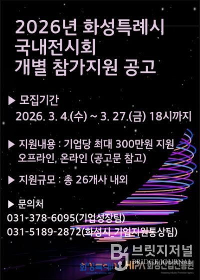 브릿지저널 김경미 기자 | 화성산업진흥원은 관내 중소기업의 국내 판로 확대와 브랜드 인지도 제고를 위해 ‘2026년 화성시 국내 전시회 개별참가 지원사업’을 추진하고, 참여기업 26개사를 모집한다고 밝혔다.