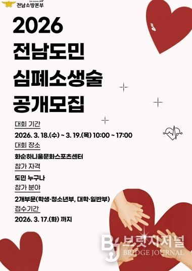 브릿지저널 김경미 기자 | 전남소방본부가 도민의 응급상황 대처 능력을 높이고 생명 존중 문화를 확산하기 위해 오는 3월 17일까지 ‘제15회 일반인 심폐소생술 경연대회’ 참가팀을 전격 모집한다.