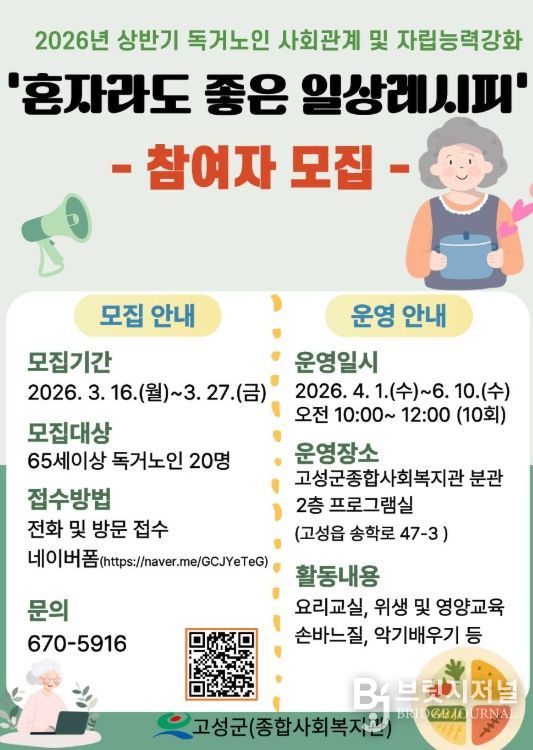 브릿지저널 김경미 기자 | 고성군이 운영하는 고성군종합사회복지관은 오는 3월 16일부터 관내 65세이상 독거노인을 대상으로 2026년 상반기 독거노인 사회관계 및 자립능력강화 프로그램'혼자라도 좋은 일상레시피' 참여자 20명을 모집한다.