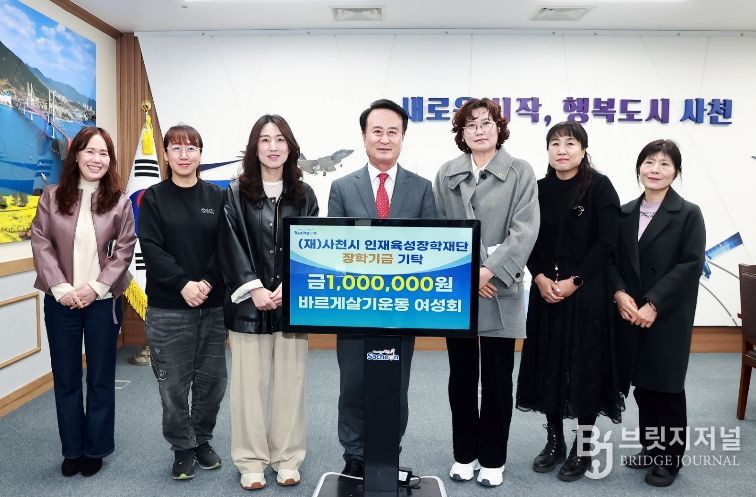 브릿지저널 김경미 기자 | 바르게살기운동 사천시협의회 여성회(회장 이옥진)는 10일 사천시청 시장실을 방문하여 지역 사회의 미래를 이끌어갈 인재 양성을 위해 사용해 달라며 사천시 인재육성장학재단(이사장 박동식)에 장학금 100만 원을 기탁했다.