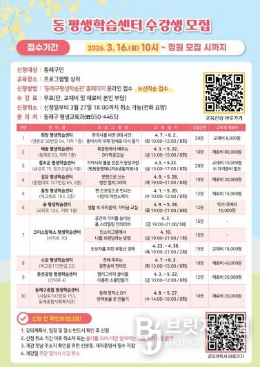 브릿지저널 윤나영 기자 | 부산 동래구는 오는 4월부터 6월까지 동별 평생학습센터에서 다양한 평생교육 프로그램을 운영하고 수강생을 모집한다고 밝혔다. 이번 프로그램은 구민들에게 생활권 내 평생학습 기회를 제공하기 위해 마련됐다.