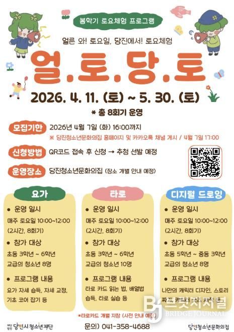 브릿지저널 정보영 기자 | (재)당진시청소년재단 당진청소년문화의집은 봄학기 토요체험 프로그램 '얼.토.당.토'를 운영하고 참가 청소년을 모집한다. '얼.토.당.토'는 ‘얼른 와! 토요일, 당진에서! 토요체험’의 줄임말로, 당진시 청소년들이 주말을 보다 즐겁고 의미 있게 보낼 수 있도록 기획된 체험형 프로그램이다.