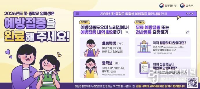 초등학교 입학생은 △DTaP 5차 △폴리오 4차 △MMR 2차 △일본뇌염 등 4종의 접종 완료 여부를 확인해야 하며, 중학교 입학생은 △Tdap(또는 Td) 6차 △일본뇌염 △HPV 1차(여학생) 등 3종의 접종 여부를 확인해야 한다.
