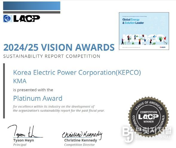 브릿지저널 김경미 기자 | 한국전력의 지속가능경영보고서가 미국 커뮤니케이션 연맹 LACP(League of American Communications Professionals)가 주최하는 '2024/25 비전어워드(Vision Awards)'유틸리티 분야에서 2016년 이후 10년 만에 최고 등급인'대상(Platinum)'을 수상했다.