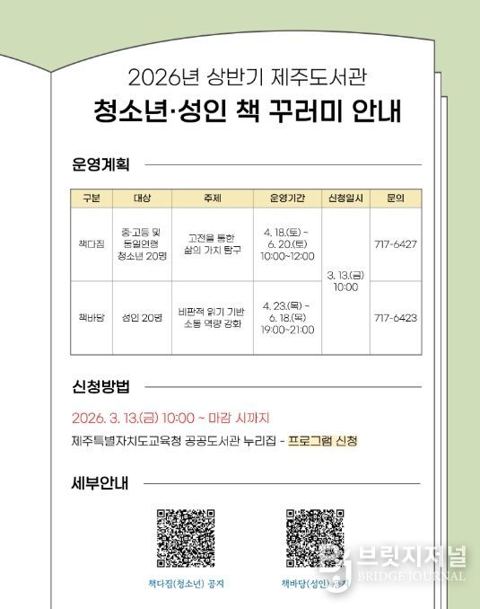 브릿지저널 정보영 기자 | 제주도교육청 제주도서관은 독서를 통한 사고력 신장과 소통 역량 강화를 지원하기 위해 ‘2026년 상반기 책 꾸러미’를 운영한다.