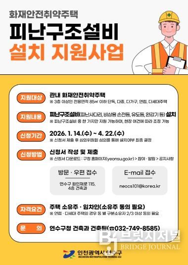 브릿지저널 김경미 기자 | 연수구가 화재 발생 시 대피시설 부족으로 인한 인명 피해를 예방하기 위해 소규모 주택을 대상으로 ‘피난구조설비 설치 지원사업’을 추진한다.