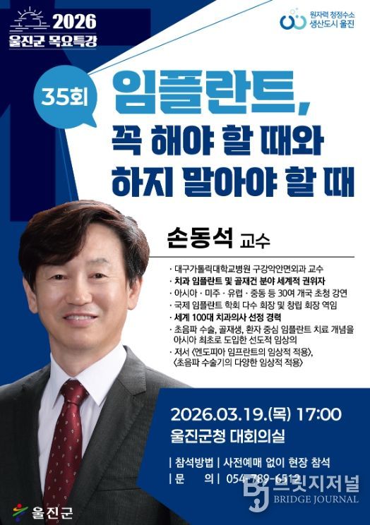 브릿지저널 정보영 기자 | 울진군은 오는 3월 19일 오후 5시 울진군청 대회의실에서 손동석 교수를 초청해‘임플란트, 꼭 해야 할 때와 하지 말아야 할 때’를 주제로 제35회이자 2026년 첫 목요특강을 개최한다.