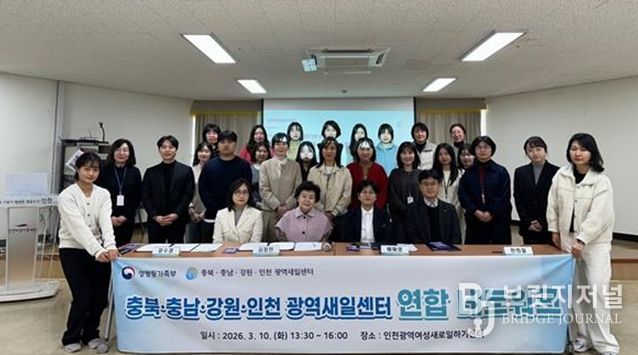브릿지저널 김경미 기자 | (재)인천여성가족재단 인천광역여성새로일하기센터는 2026년 3월 10일 오후 1시 30분, 재단 소강당에서 강원광역여성새로일하기센터, 충북광역여성새로일하기센터, 충남광역여성새로일하기센터와 함께 ‘중부권 광역여성새로일하기센터 연합 네트워크 구축을 위한 다자간 업무협약'을 체결했습니다.