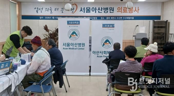 브릿지저널 김경미 기자 | 제천시 수산면 ‘수산체험마을’ 1층에서는 수산면 주민자치위원회 주관으로 서울아산병원 의료봉사팀의 이동병원 진료가 진행돼 지역 주민들에게 따뜻한 온기를 전했다.