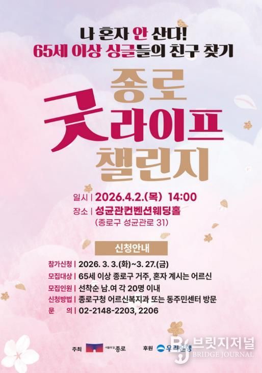 브릿지저널 김경미 기자 | 종로구는 홀로 지내는 어르신들에게 새로운 만남의 기회를 제공하고 활기찬 노년을 응원하기 위해 '2026년 상반기 종로 굿라이프 챌린지'를 개최한다.