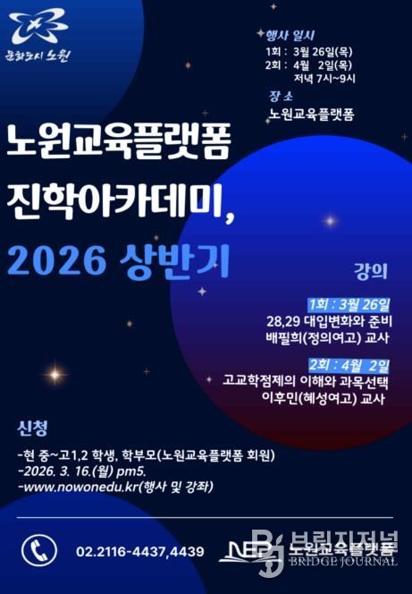 브릿지저널 김경미 기자 | 서울 노원구는 공신력 있는 교육 정보 제공을 위해 ‘2026년 상반기 노원교육플랫폼 진학아카데미’를 운영한다고 밝혔다.