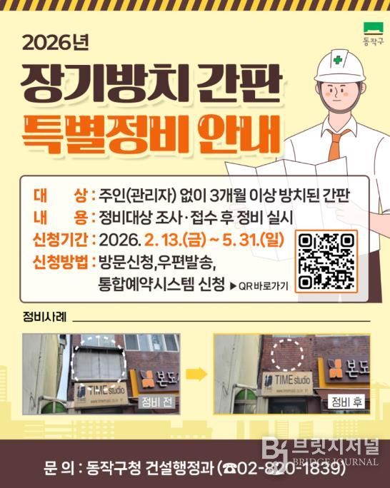 브릿지저널 김경미 기자 | 동작구가 장기간 방치된 노후·위험 간판을 정비해 안전사고 예방 및 도시경관을 개선하고자 ‘장기방치 간판 특별정비 사업’을 추진한다고 밝혔다.