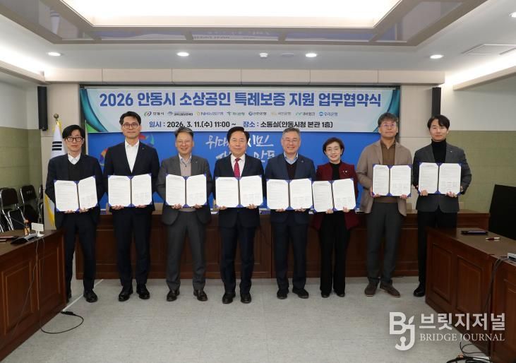 브릿지저널 정보영 기자 | 안동시는 3월 11일 시청 소통실에서 경북신용보증재단 및 6개 협약은행과 함께 '2026년 안동시 소상공인 특례보증 지원 업무협약'을 체결했다.