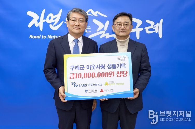 브릿지저널 김경미 기자 | 전남 구례군은 3월 11일 (주)바로저축은행에서 관내 취약계층을 위한 1천만 원 상당 물품을 기탁하는 전달식을 가졌다고 밝혔다.