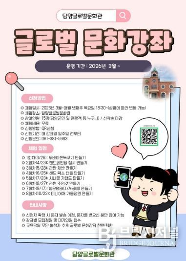 브릿지저널 김경미 기자 | 담양군이 지난해에 이어 올해도 3월부터 12월까지 매월 마지막 주 목요일에 담양글로벌문화관에서 ‘글로벌 문화강좌’를 운영한다.