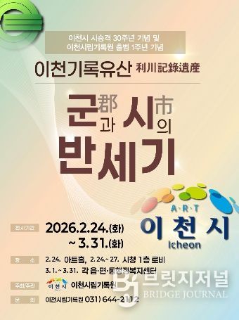 브릿지저널 김경미 기자 | 이천시는 시 승격 30주년과 이천시립기록원 출범 1주년을 기념하여 기획된 ‘이천기록유산(利川記錄遺産): 군(郡)과 시(市)의 반세기’ 전시를 오는 3월 31일까지 14개 읍면동 행정복지센터에서 순회전시로 연장 개최한다고 밝혔다.