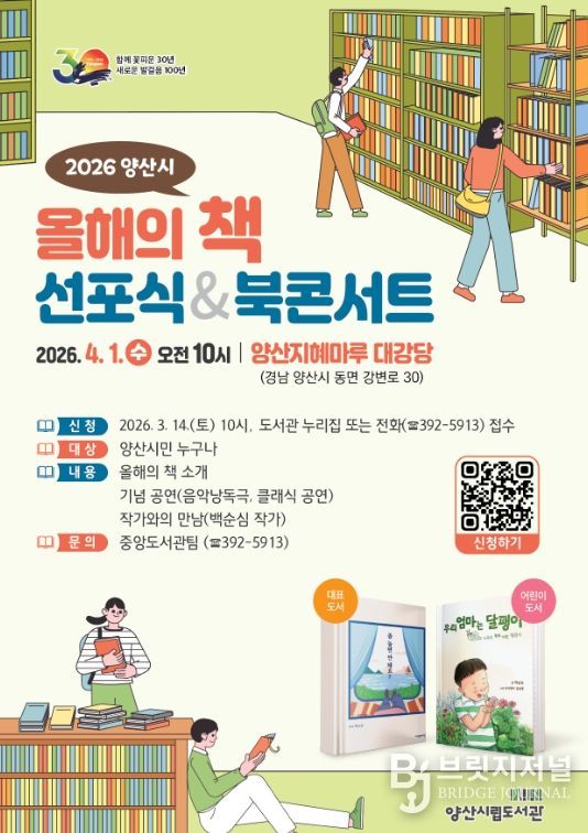 브릿지저널 김경미 기자 | 양산시립도서관은 오는 4월 1일 오전 10시, 지혜마루 대강당에서‘2026년 올해의 책 선포식 및 북콘서트’를 개최한다.