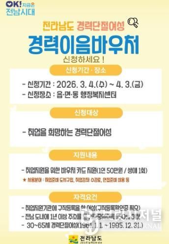 브릿지저널 김경미 기자 | 전라남도는 출산과 육아 등으로 직장을 그만둔 후 재취업에 어려움을 겪는 경력단절 여성을 대상으로 ‘경력이음바우처’ 이용자를 모집한다고 밝혔다.