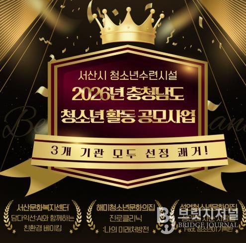 브릿지저널 정보영 기자 | 서산시 청소년수련시설(서산문화복지센터, 해미‧성연청소년문화의집) 3개 기관이 충남사회서비스원 청소년활동진흥센터가 주최한 '2026년 충청남도 청소년 활동 프로그램 공모사업'에 선정됐다고 밝혔다.